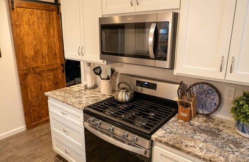 We have a full kitchen with all the items you would require to cook your favorite meal, if you so choose. It is a full-sized refrigerator, dishwasher, coffeemaker, stove, microwave, blender, and wine opener to enjoy any bottles you may have purchased on your adventures.