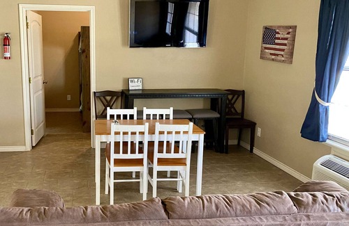 With hillside views and an fireplace, it’s the perfect getaway for your family. HR Cabin #4 can sleep up to 6 people. The cabin is equipped with a fully furnished kitchen, dining area and living room. The two bathrooms have showers. There is a smart 50" TV connected to DIRECTV in the living room and internet access. It has a front porch with great views and additional patio out back. If you’re traveling with a bigger party, ask us about booking multiple cabins together.