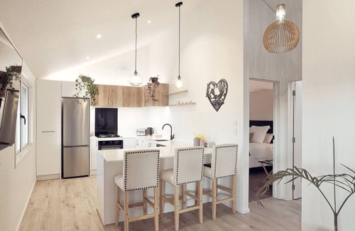 The Huntsbury Hideaway is a boutique 2-bedroom cottage that can accommodate up to 4 people in two luxuriously furnished queen bedrooms, complete with wardrobes. Each room has its own unique view. The sumptuously lit bathroom boasts a large shower under a skylight.