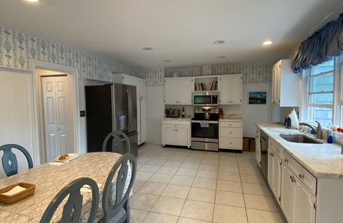 Classic Cape Cod home overlooking Hyannis Port harbor and Nantucket Sound. Steps to sandy beach, huge wraparound porch with plenty of seating to relax with friends and family, enjoy an outdoor dinner or play some ping pong. The dining room and kitchen both seat 8 comfortably, great for entertaining! Barbeque on the back patio overlooking the harbor. The home has 8 bedrooms, ( 5 King beds ,1 Queen and 4 twins), 4 and a half baths, plus and outdoor shower. Complete kitchen, expansive living spaces, large lawn, wi-fi and TVs.