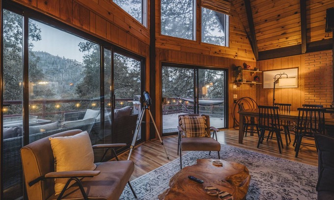 Escape the stress of the city and relax at our Sierra Nevada Mountain Get-A-Way. Located in the Sequoia National Forest, you won’t find any crowded entrances or long traffic lines to enter any national parks here. This custom-built 3-level cabin sits on over 1 acre of private land and features floor to ceiling windows, vaulted knotty-pine ceilings with exposed beams, and alder wood cabinets in the spacious kitchen. Whether you’re looking to gaze at the stars around a warm fire, wrap your arms around the largest trees in the world, or just enjoy a fresh cup of coffee as you watch the deer stroll by; we know you will make memories in this magical place.