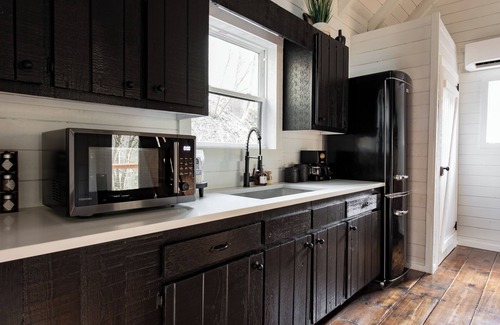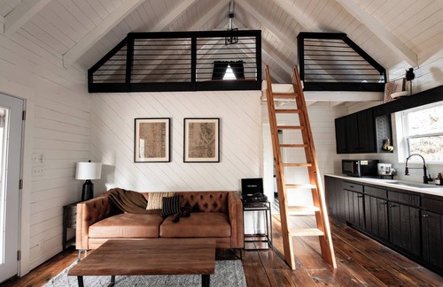 Hygge Hollow cabin can sleep up to 4 guests with 2 bedrooms, 1 being a bedroom on the main level and the other being an open loft, with a queen size bed in each. The kitchen features an induction one-eye cooktop, convection microwave and full size refrigerator. Outside, there is a charcoal grill, hot tub and solo fire pit with firewood provided. There is a smart tv in the living room and main floor bedroom. There is a laundry closet in the kitchen for guest use.