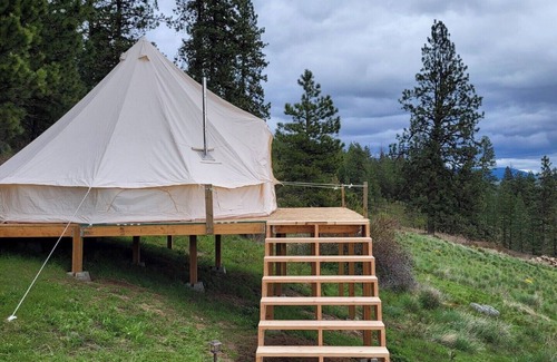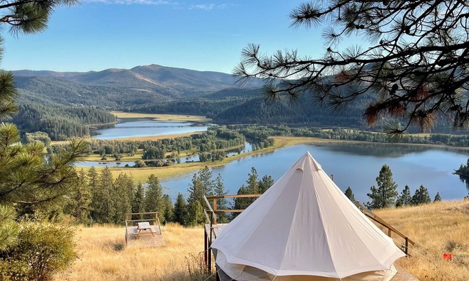 Idaho Getaways Beautiful Glamp tent with lakeview of Lake Coeurdalene & campfire | Cabin in Harrison