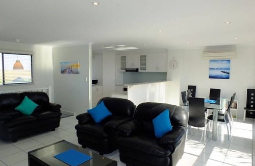 This fully equipped holiday home has 5 bedrooms and sleeps 10, comprising 2 queen rooms, one upstairs with ensuite, on the lower level there is a queen bedroom, a double bedroom and 2 rooms with 2 single beds in each. It has 2 living areas which makes it ideal for 2 families (families with children). All bedrooms have ceiling fans. Each level has heating/cooling.