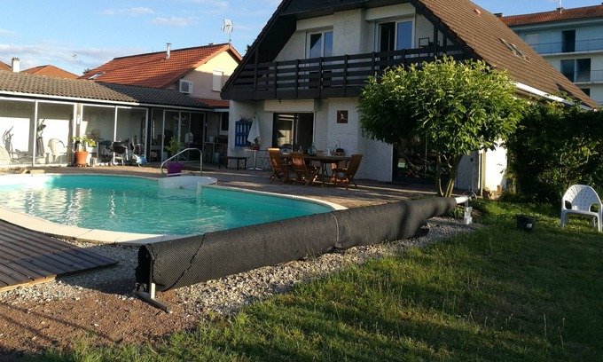 Friendly house of 170 m², composed of a large living room and an equipped kitchen, 5 bedrooms, 1 office. Ideal for 2-3 families with children. Garden with swimming pool, table tennis, basketball. You can enjoy the barbecue and the plancha as well as various household appliances. Roanne is a pleasant city with very beautiful villages of character in the surroundings, a greenway for cyclists, many routes for hikers ... is located 1 hour from Lyon. A deposit of 1500 € will be required. You will find the accommodation clean and we want to recover it in the same state of cleanliness. You can contact me for any questions. I wish you a pleasant stay in our house. You can contact me by mail