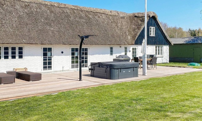 About the holiday home This idyllic holiday home with thatched roof is located in a quiet area in Gedesby. The house is divided into two sections, each with its own kitchen, living room and bathroom, but with enough space for everyone to gather in the large living room around the large dining table or on the terrace. On the 1st floor there are 2 activity rooms and 2 bedrooms. The holiday home is well-equipped with white goods, kitchenware, free wireless internet, WiFi speakers, TV with Chromecast for streaming, darts, table football and games console/Playstation. There are Danish and German channels on TV. Energy-friendly holiday home with wood-burning stove and air/water heat pump. There is also a dishwasher, washing machine and tumble dryer. In the large garden you can play football with goals or enjoy life on the large wooden terrace, where there is an outdoor hot tub and outdoor shower, barbecue, sun loungers and garden furniture. If you're into fishing, there's a cleaning station and a deep freezer with a minimum capacity of 60 litres, and it's about 1,500 metres to the coast where you can swim and fish. Gedesby beach is a good child-friendly wide sandy beach. Not available for youth groups.A refundable deposit might be charged closer to your check-in date. Thesecuritydepositensuresasmoothstayandcoversany additionalservicesorconsumptioncharges.Thisdepositcoversutilitiesconsumedduringyourstay andanyadditionalservicesthatmaybetaken.Thefinalamountwillbeadjustedbasedonactualmeter readings,actualusageofextraservices,andanyremaining balancewillberefundedwithin21daysaftercheckout.Thisdepositsimplyactsasaprepaymentforchargesthat youwouldanywayspayfor,ensuringaseamlessstayand check-outexperience.