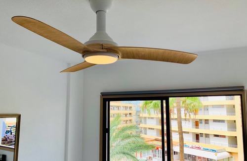 Floor-standing fan in the living room, ceiling fan in the bedroom.