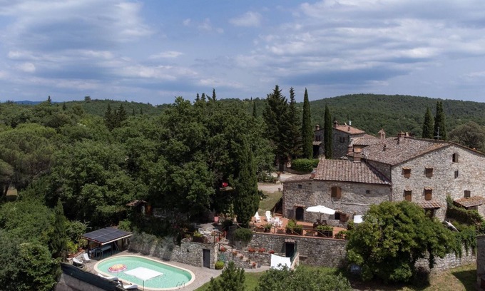 Il Cipresso is a lovingly furnished holiday home, ideal for a couple or a small family. It is located on the ground floor of a natural stone house in a small medieval hamlet on a hill in the heart of the Chianti Classico, between Radda and Castellina. The site was once an Etruscan settlement and still retains a unique historical atmosphere. From the private terrace and well-tended garden, guests can enjoy wide views of the typical Tuscan hills.