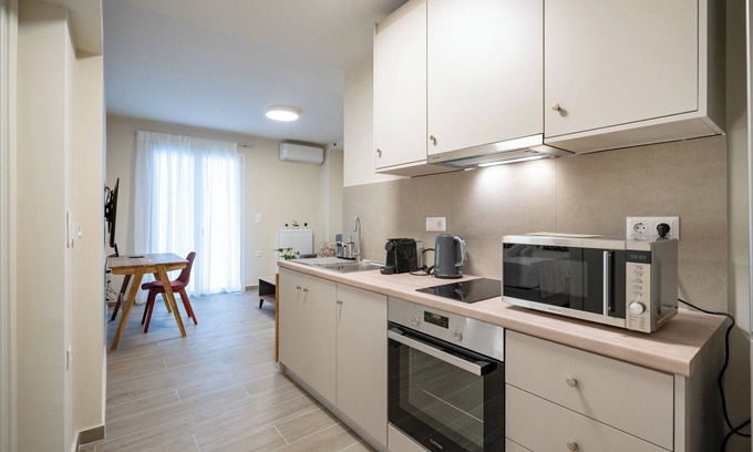 Escape to this charming and elegantly furnished apartment in the serene Ilisia area, perfect for couples or solo travelers looking to explore Athens. With its strategic location and thoughtfully designed spaces, this one-bedroom retreat offers both comfort and convenience. Step into a soothing environment where every detail has been curated to ensure a relaxing stay. The living room, decorated with tasteful accents and soft, inviting colors, features comfortable seating perfect for unwinding after a busy day. Enjoy your favorite shows or a good movie on the flat-screen TV, or simply recline with a book in the peaceful ambiance of the apartment. The separate bedroom is a dreamy sanctuary with a deluxe queen-sized bed, quality linens, and ample wardrobe space to store your belongings. Prepare meals in the fully equipped kitchen, which boasts modern appliances, including a stove, oven, refrigerator, and all the necessary utensils and cookware. Whether it’s breakfast coffee or an evening snack, the kitchen is set up to handle all your culinary needs