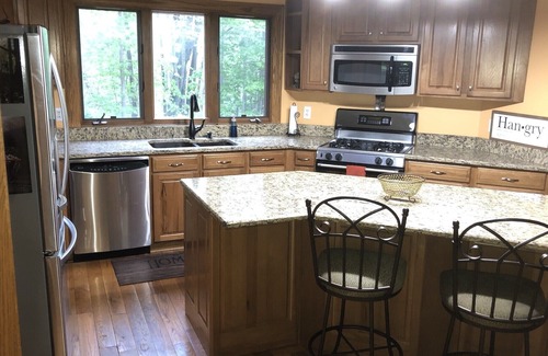 Be prepared as you enter to be greeted by beautiful piano music. The first room you will see is the piano room. Don't worry that you don't play because it plays by itself! Next, you'll notice great seating for 8 in the dining room. Walk on in to see a fantastic living room featuring a beautiful fireplace, comfortable seating for the whole group and a large Smart TV. The kitchen is modern and well equipped. There is kitchen island seating plus seating for 6 at the solid cherry craftsman kitchen table looking out to the patio and the wooded back yard.