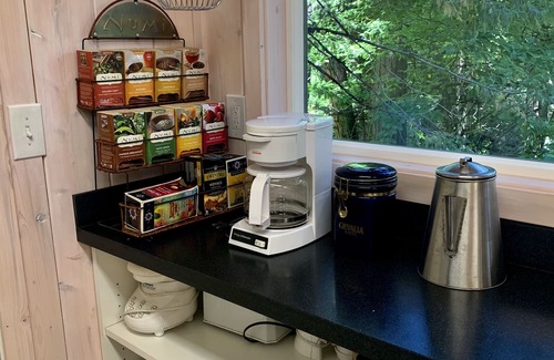 The cabins date back to 1949 but were recently completely renovated. Cabin 3 (Alpina) has a king bed, TV/DVD, seating area, kitchen, full bathroom with bathtub/shower and private patio. Cabin 2 (Belvedere) has a queen bed, TV with Apple TV, dining room that seats six over looking the forest, electric fireplace, full bathroom with bathtub/shower and patio. Cabin 1 (Clairmont) has a queen bed, TV/DVD, mini-refrigerator, coffee pot, microwave, full bathroom with bathtub/shower, seating area and patio.