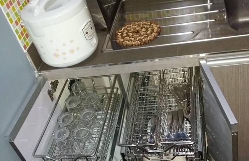 Those who love to cook will like the well-equipped kitchen. The dining table comfortably sits five persons. The kitchen cabinetry is bespoke and has standard sized sink and drawer baskets for the cutlery and cooking utensils. There are dual hot plate hobs, chimney range hood, small oven toaster, rice cooker and refrigerator.
