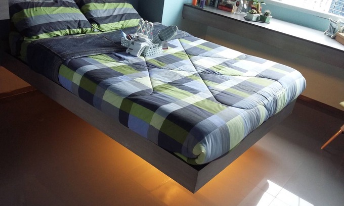The floating master bed is very unique and adds to the sense of relaxation. The bed room is served by a dedicated split type air conditioner, a walk-in closet and a wide work table that views to the city skyline. For those travelling with companions, there is a separate elevated bunk bed which is of standard size. The bedroom intentionally has down lighting to encourage rest. Floor, work table and closet are all well illuminated but other sections may artificially appear dim.