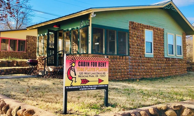The Flute Player is one of our 2 cottages in this small community of rentals. It is in the heart of Medicine Park! Enjoy a 3 minute stroll to the shops, galleries & restaurants, or a short drive to the many activities the area has to offer. Flute Player is perfect for your weekend getaway, romantic retreat, reunions or military graduations. Some of the cabin amenities include: fully equipped kitchen, AC & heat, screened in porch, streaming TV & complimentary coffee, tea & bottled water.