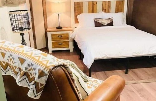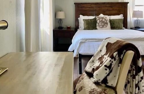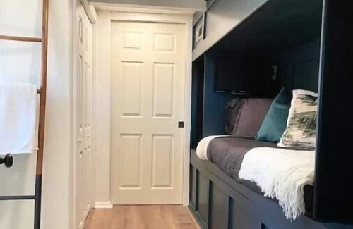 The home has modern and vintage elements not lacking in unique charm or character including its high exposed wood beam ceilings upstairs and wood accents throughout. the home can sleep up to 9 with 2 queen bedrooms, 1 room with a full and 2 twin bunk bed, 1 room with a built in twin bed and a futon couch in the living room.