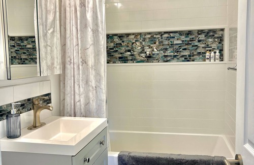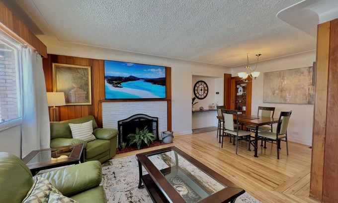 The home is a duplex-style unit with one other unit next to it. Each unit has its own private parking and entrance area. Walking into the suite, guests will enter a foyer where they can hang their jackets and take off their shoes. The home is equipped with a charming living room, dining area, and kitchen. Guests will have access to their own laundry facilities with stocked laundry supplies for longer stays. There are three bedrooms in the home, one with a queen bed, one double, and one twin. There is also one bathroom in the home that comes stocked with shampoo, conditioner, and body wash!