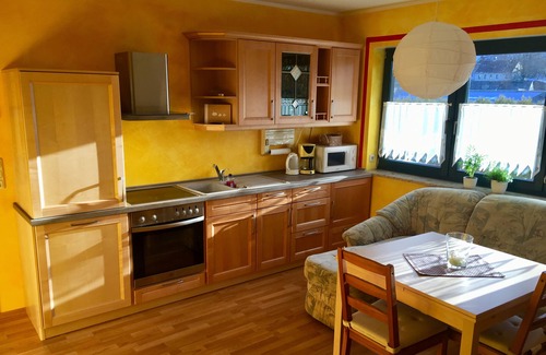 Welcome to our apartment in the world heritage region Erzgebirge in Grünhainichen. You can expect a modern furnished apartment with bathroom and private entrance. Everything you would expect from a holiday today, you can find with us. A top equipped high-quality real wood fitted kitchen with dishwasher, oven with ceramic hob, fridge and microwave will delight you. A double bed and a sofa bed can accommodate 3-4 people.