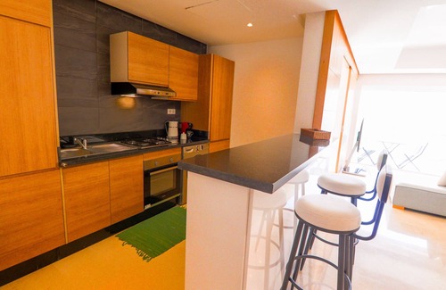 It is composed of a living room (with sofa bed area) with sea view, a fully equipped open kitchen,