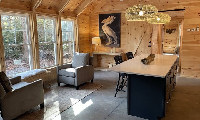 Ready for your getaway to Irvington, VA. One floor with two bedrooms each with private bathroom w no barrier walk in shower. Great room w full kitchen and 65 in TV. Covered proch in front, rear deak. Lots of privacy but in the heart of Irvington in the golf cart zone. Brand new construction 2023.