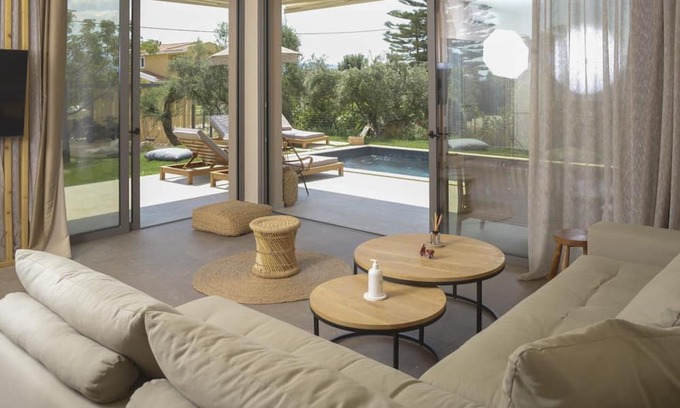 The two independent luxury villas are located just 300 meters from Kalamata Beach and have unobstructed views of the Peloponnese mountains. Elaia Grove is the ideal accommodation option for those seeking tranquility and relaxation on holiday. The lush garden, private pool terrace is equipped with comfortable sun loungers, garden seating and a dining area for endless moments of relaxation and memories. unforgettable summer.