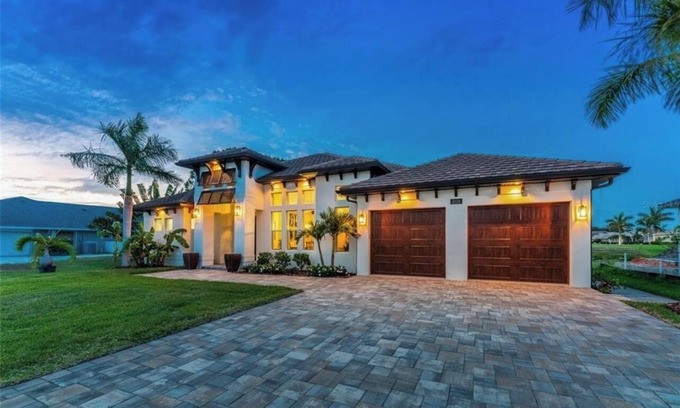 True to its moniker, "Island Breeze", this custom-crafted home was thoughtfully designed to honor its distinctive West Indies style. Upon entry, guests feel immediately at home in a carefully curated environment that is infinitely comfortable and effortlessly elegant, designed to accommodate a large gathering or a 5:00 cheeseboard with the same graceful aplomb. With a design that makes the kitchen, great room, and dining room the heart of family life, 10' walls combined with voluminous 12'-16' ceilings define the main living area creating a space best described as 'spacious but not ostentatious' with style characterized by thoughtful attention to symmetry and proportion. The upscale kitchen offers custom-crafted 42" soft-close cabinetry w/glass doors, a wine rack, pull-outs for spices/pans, and a coffee station. The resident chef will appreciate professional-grade Kitchen-Aid appliances including a 6-burner gas range with a convection oven, a multi-door refrigerator, dishwasher, a space-saving microwave, exotic marble countertops, a Koehler Farmhouse sink, and a custom pantry w/double glass doors. Nearby, the laundry room has built-in shelving/storage niches, a desk, and an oversized Whirlpool washer/dryer. Connecting the indoors to the outdoor oasis was a top priority in the design of this home, with 90-degree sliders that open to the oversized lanai (comprised of artistic pavers manufactured in Miami), where a custom-designed heated saltwater pool with an 8' cascading waterfall, stepping stones, a sun shelf w/two pool loungers, and an extended height pool cage w/clear-view screen to maximize water views --all with a highly coveted Northwestern exposure and an intersecting canal view, await. Fuss-free furniture is arranged to encourage leisurely conversation and relaxation, and there is a cozy fire pit to ease the chill of cool evenings. The nearby cabana exudes casual sophistication with its hand-crafted Cypress ceiling, sink, grill, refrigerator, and built-in ice bin. An island with a granite top is a natural gathering place for family and friends, creating an undeniably 'resort-style' atmosphere. The Primary suite was designed for relaxation, with a spa-like ambience characterizing the bathroom. Here, an exquisite chandelier, dual vanities, a Victoria and Albert freestanding soaking tub, a walk-in shower with a Hansgroehe rain shower head, Brizo water faucets, and a private water closet with a bidet are found. Two oversized guest bedrooms share a bathroom that offers a large walk-in shower, Mahogany cabinetry, and marble countertops. Guests will delight in the 10'x10' outdoor shower with 5' stucco walls and a vaulted screen cage roof for privacy. Meticulously maintained mature Florida landscaping, a customized plantation-style concrete tile roof, an eye-appealing brick paver driveway and an 8' wide entry walk enhance the home's extraordinary outdoor appeal. Nestled in the highly desired golf community of Rotonda West, this stunning home is where timeless beauty meets unrivaled quality.
