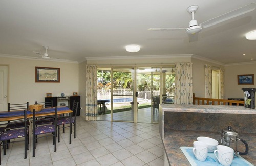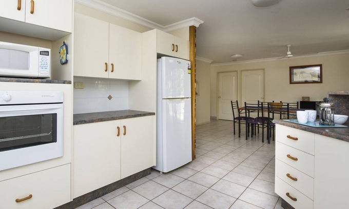 Island Dreams is located on a peaceful Nelly Bay street but close enough to stroll to the Nelly Bay beachfront. The main bedroom features a queen bed and ensuite. The 2nd bedroom also has a queen bed and the 3rd bedroom has 2 single beds plus a trundle bed. The crystal clear pool is safely placed in the secure backyard. Enjoy a BBQ on the back patio while the kids play in the pool.