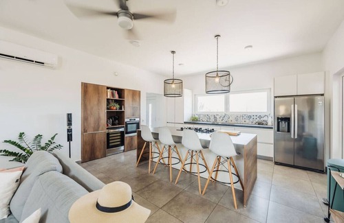 Living Area: The open-concept living area is perfect for socializing and unwinding. Relax on the cozy sofas while enjoying the warmth of the Aruban breeze, or gather around for a movie night on the large flat-screen TV. Floor-to-ceiling windows offer panoramic views of the lush surroundings.