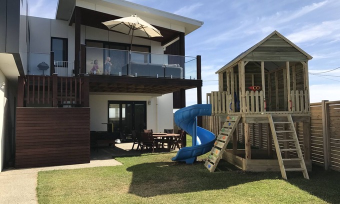 Upstairs comprises of the kitchen, butlers pantry, lounge, dining, Master Bedroom with en-suite, bedroom 2, powder room & toilet. Downstairs you will find the fully equipped laundry, bathroom with bath & shower, seperate toilet, rumpus room & bedrooms 3 & 4. From here you can access the back yard with a cubby house, climbing wall & slide for the kids. Around the side of the house you will find the hot outdoor shower for washing off the sand from those long beach days.