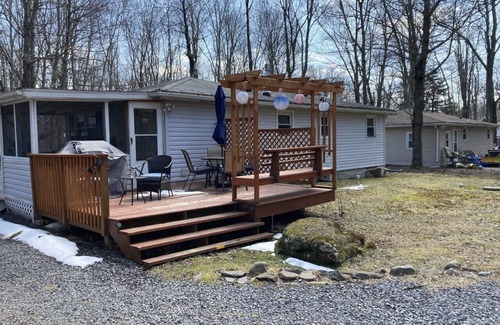 Perfect for families, couples and solo travelers. Traditional mountain cottage with two bedrooms, one bathroom, living room and separate dining room. There is also a screened in three season room and a patio. Community association hosts numerous events and there are three pools and two lakes. Close to skiing, outlet shopping, Pocono Raceway, Kalahari water park, hiking, biking and water sports. Enjoy nature all year round!