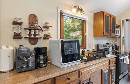 Unwind in the inviting living space, where a large flat-screen Roku TV, cozy sitting chair, and a dining area for four make staying in just as enjoyable as heading out. The well-appointed kitchen includes a full-size refrigerator, coffee bar, countertop dishwasher, and all the essentials to whip up a quick breakfast or full dinner. You’ll find a dedicated desk with a printer, perfect for remote work or a quick check-in with the office.