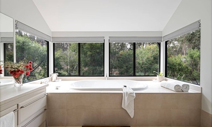 The chalets feature beautiful rammed earth walls, warm wooden floors, and a carpeted bedroom with a King-size Marri bed, quality mattress, plush pillows, and linens. Enjoy reverse cycle air conditioning in both the bedroom and living room. The bathroom boasts a deep two-person bathtub set in a bay window overlooking the forest, and a spacious two-person rain shower. There’s also a separate toilet, laundry with a washing machine, a 55" Smart Ultra HD TV with free streaming services, Bluetooth speaker, and a fully equipped kitchen with a dishwasher and microwave. Additional features include a cosy wood heater (seasonal use), beautiful Marri wood furniture, outdoor hot tub, dining furniture, a Weber gas BBQ on the covered timber deck, and sheltered parking.