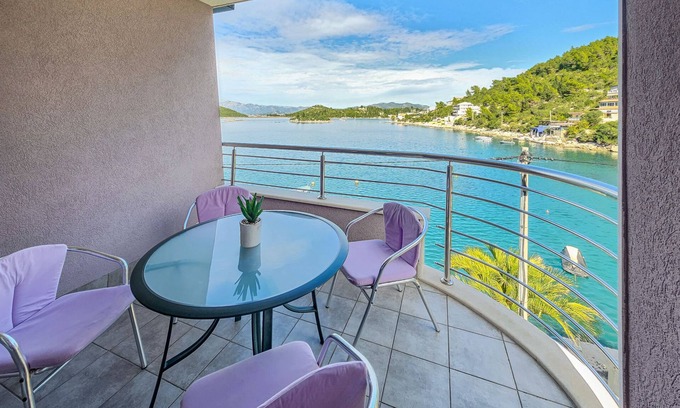 3-room apartment 48 m2 on 2nd floor. Living/dining room with 1 sofabed (150 cm, length 190 cm), satellite TV and air conditioning. Exit to the balcony. 2 rooms, each room with 1 french bed (160 cm, length 200 cm), air conditioning. Exit to the balcony. Open kitchen (oven, 4 ceramic glass hob hotplates, kettle, microwave, freezer, electric coffee machine) with dining table. Shower/WC. 2 balconies 2 m2, balcony 8 m2. Balcony furniture, deck chairs (12). Marvellous panoramic view of the sea. Facilities: mosquito net. Internet (WiFi, free). Maximum 1 small pet/ dog allowed.