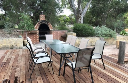 - Downstairs House has 3 large bedrooms (1 queen bed),(1 double and 1 single) (the other 3 single beds) very large open area with lounge, fully equipped kitchen/dining. Airconditioned, Tile fire, Sweep Fans, Oil heaters. Bathroom with separate toilet. Games room attached, loads of books, videos and DVD's for your entertainment. There are 2 bbq's 1 gas and 1 woodfire, outdoor settings, Patio and upstairs balcony over looking a lake.