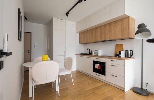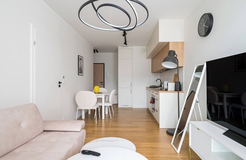 Jerozolimskie Modern Apartment features a living room with a sofa bed and kitchenette, a bedroom with a king-size bed, a bathroom, and a spacious balcony where guests can relax while enjoying a morning coffee or an evening glass of wine. Guests have access to a range of practical amenities, including free WiFi, a television, an iron, a hairdryer, a dishwasher, a refrigerator with freezer, an induction hob, an oven, a kettle, a capsule coffee machine, and essential kitchenware. The apartment is equipped with air conditioning, providing exceptional comfort—especially during warmer days. A parking space in the garage is also available for guests. The parking platform can accommodate a vehicle with a maximum weight of up to 2 tons, with a load of 500 kg per wheel, a length of 5000 mm, a width of 1900 mm (excluding mirrors), and a height of 1800 mm.