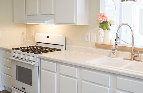 Fully Equipped Kitchen with microwave, oven, dishwasher, cookware, dishes, utensils, and kitchen tools.