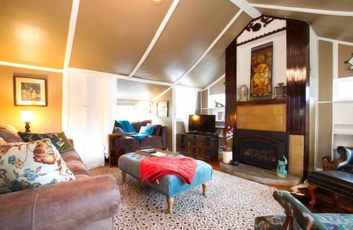 This darling home, known as The Steinbeck Cottage, has a beautiful living room with a tent cathedral ceiling. It's focal point is the fireplace, richly adorned with carvings of birds and flowers. It has a queen sleeper sofa, a love seat, two reading chairs and a flatscreen TV.