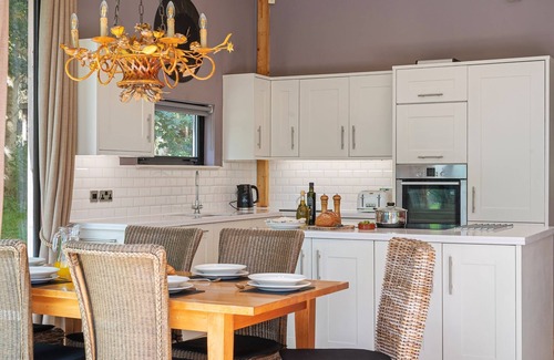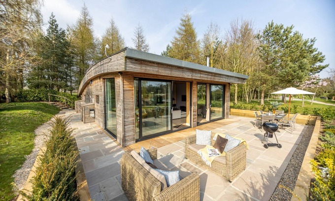 This incredible hot tub lodge at Brompton Lakes is the depiction of a calm and contemporary design. Wonderful views through the panoramic windows make a perfect year-round luxury escape.