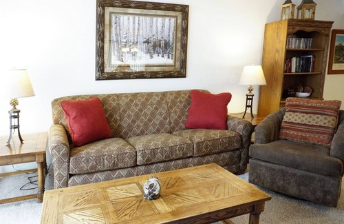 This is the perfect condo for guests who don’t want to tackle stairs, featuring a spacious floorplan, with lovely views. Bring your entire family and enjoy this roomy mountain getaway. This condo is located close to the shared hot tub, and a short walk to the tennis courts. The furnishings are welcoming and you are certain to feel warm and relaxed sitting by the wood burning fireplace. Enjoy the sunny deck and gas grill all year round. The kitchen is well stocked to prepare your gourmet meal and the dining area offers seating for 6. Play a board game while sitting at the game table or snuggle on the sofa and watch a movie. There is a laundry area with a full size washer and dryer and a generous pantry to tuck away all of your food items. This is a single story condo.