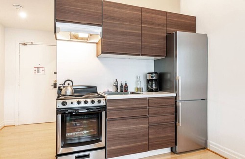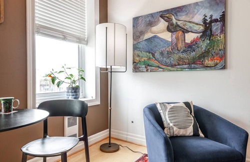 Welcome to our soulful studio retreat in Stratford's vibrant downtown. Framed by warm walnut tones & bold Canadian artwork, this designer space offers an inspiring blend of calm & creativity. Relax in a plush queen bed, unwind with a book in the sculptural lounge nook, or sip morning coffee beside the sunlit café table overlooking historic streets.