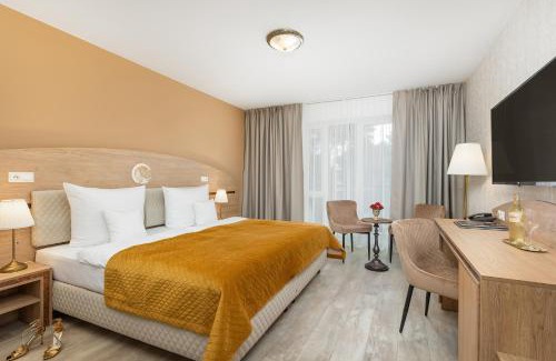 Located in Międzywodzie, a 3-minute walk from Miedzywodzie Beach, Juvena Hotel Wellness & SPA Adults Only 12 plus provides accommodations with a garden, private parking, a shared lounge and a terrace. Featuring a seasonal outdoor swimming pool, the 4-star hotel has air-conditioned rooms with free WiFi, each with a private bathroom. Guests also enjoy access to the indoor pool and fitness center, as well as the sauna and hot tub. All rooms in the hotel are equipped with an electric tea pot. Each room has a closet and a flat-screen TV, and certain rooms at Juvena Hotel Wellness & SPA Adults Only 12 plus have a balcony. Guest rooms will provide guests with a fridge. The accommodation offers a buffet or continental breakfast. At Juvena Hotel Wellness & SPA Adults Only 12 plus you'll find a restaurant serving Local, International and European cuisine. The area is popular for cycling, and bike rental is available at the hotel. Speaking German, English and Polish at the 24-hour front desk, staff are willing to help at any time of the day. Świnoujście Train Station is 23 miles from Juvena Hotel Wellness & SPA Adults Only 12 plus, while Zdrojowy Park is 27 miles away.