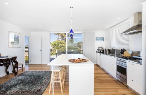 The upstairs area is an open plan living/dining & kitchen with beautiful views to Cormorant beach and the ocean from the front. At the rear guests can enjoy south east views to Brush Island.
