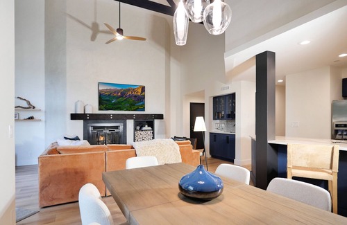 Nestled in the heart of Mountain Village, KAYENTA LODGE is surrounded by a grove of mature trees, providing a sense of cabin-like privacy. The living area features soaring vaulted ceilings, sturdy wood beams and trim, and a cozy sleeping loft accessed by a ladder. Sink into the warm leather sofa or armchair while watching the FLAT-SCREEN TV mounted next to the hearth. Large glass doors flood the space with natural light, creating a warm and inviting atmosphere—ideal for unwinding with a cocktail after a day on the slopes.