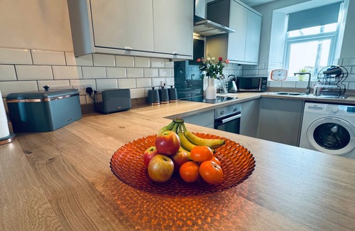 The living area has a homely feel with comfortable cushions and throws making it ideal for watching your favourite TV shows. The living area also has a dining table, perfect for socialising. The kitchen is well equipped with utensils, crockery, a kettle, toaster, microwave and basic pantry items such as oil, salt and pepper. Additional kitchen amenities include an oven, hob, refrigerator, freezer, washing machine and tumble dryer. These amenities ensure you have access to everything you need for a short- or long-term stay.