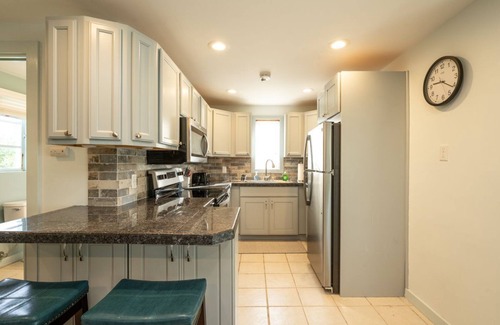 The full kitchen is equipped with new appliances, ample counter space and a breakfast bar.