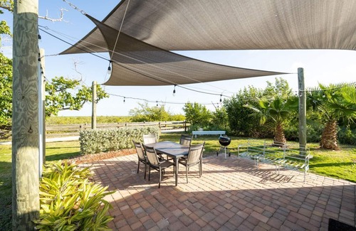 The private lighted back patio overlooks a mangrove area, which leads to the Gulf of Mexico. The outdoor area includes a patio table, fire pit, charcoal grill, and fish cleaning station. You can observe native birds and often the endangered Key Deer from the patio.