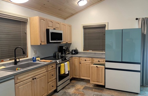 Experience the Keweenaw in the new Ahmeek South Room: ADA Accessible ground floor with tiled floor, basswood ceiling, full kitchen with dishwasher and large fridge, dining table and counter seating, sliding doors to south patio, King bed, large sectional sofa with TV, fast WiFi, desk, lovely marble tiled bathroom, washer and dryer. Truly your home away from home! Parking at the front door, EV charger included. 15% discount for weekly stays; 28% discount for monthly stays.