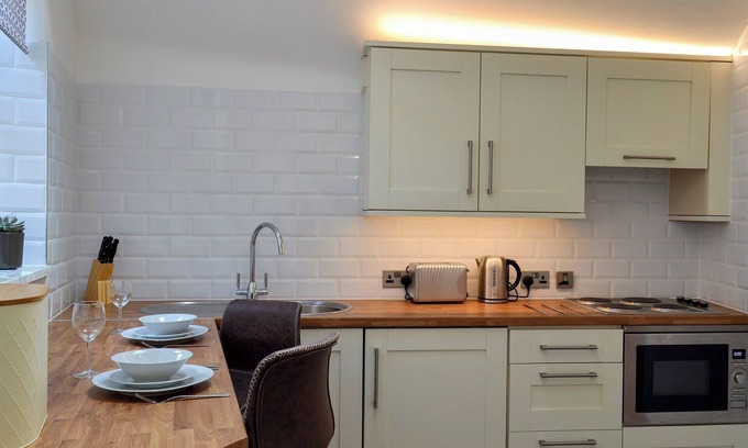 Shower Room: Cubicle Shower, Heated Towel Rail, Toilet. Electric central heating, electricity, bed linen, towels and Wi-Fi included. Travel cot and highchair included. . Enclosed courtyard garden with garden furniture. Bike store. On road parking or public car park, £2.60 per day, 350 yards away. No smoking. Please note: There are 2 steps in the garden.. This wonderful holiday apartment, renovated in 2019, can be found in the bustling High Peak market town of Glossop, on the edge of the Peak District National Park. Perfect for couples or friends alike, a hive of activity is available right on the doorstep including high street and independent shops, delicatessens, restaurants and local pubs complete with live bands.