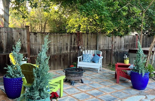 Welcome to our unique vacation retreat where a delightful 100-foot stroll through our lush, fairy-lit garden path leads you from the private detached bathroom to your private bedroom - a fun feature that makes your stay feel like a mini adventure! This cozy getaway features a Cal King & Queen Bed, FREE coffee, FREE street/driveway parking, fast Wi-Fi, and W/D. Views of illuminated private yard with Hot Tub, Patio area and Fire Pit. Kitchenette with fridge and microwave Suites are in a Quiet & Serene second back lot.