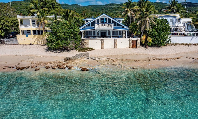 Step into paradise at this charming beachfront villa where artful luxury meets island vibes. This villa is perfectly situated on the tranquil shores of St. Croix just minutes by car from Frederiksted and the iconic Pier. With 3 spacious bedrooms featuring a mix of king, queen, full, and twin beds, this home comfortably accommodates groups of friends seeking a relaxing Caribbean getaway with your toes in the sand. 3.5 bathrooms are stocked with essentials to help you refresh after a day of swimming in the turquoise sea or exploring the island. Enjoy modern comforts like air conditioning and Starlink high-speed internet throughout the home. On-site laundry facilities make extended stays a breeze. Amenities you will love include a luxury custom designed kitchen with Wolf and Miele Appliances that include a propane stove for easy cooking, a fabulous outdoor kitchen with a beachfront gas grill, solar power generator backup for peace of mind, stand-up paddleboards for ocean adventures and an outdoor shower to rinse off the salt and sand.
