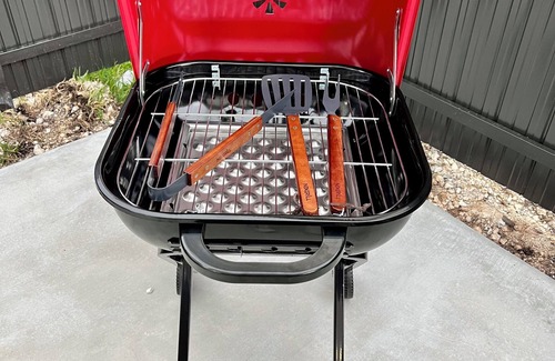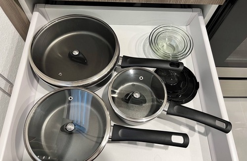 - kitchenware: pots and pans, chopping board, knives, wine opener, measuring cups, containers